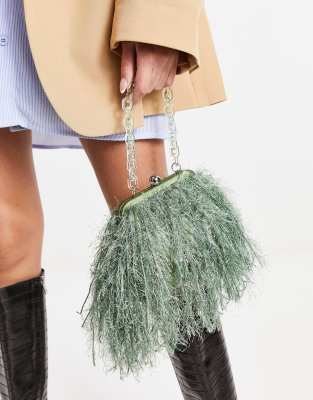 ASOS DESIGN faux feather clutch with resin handle in sage-green